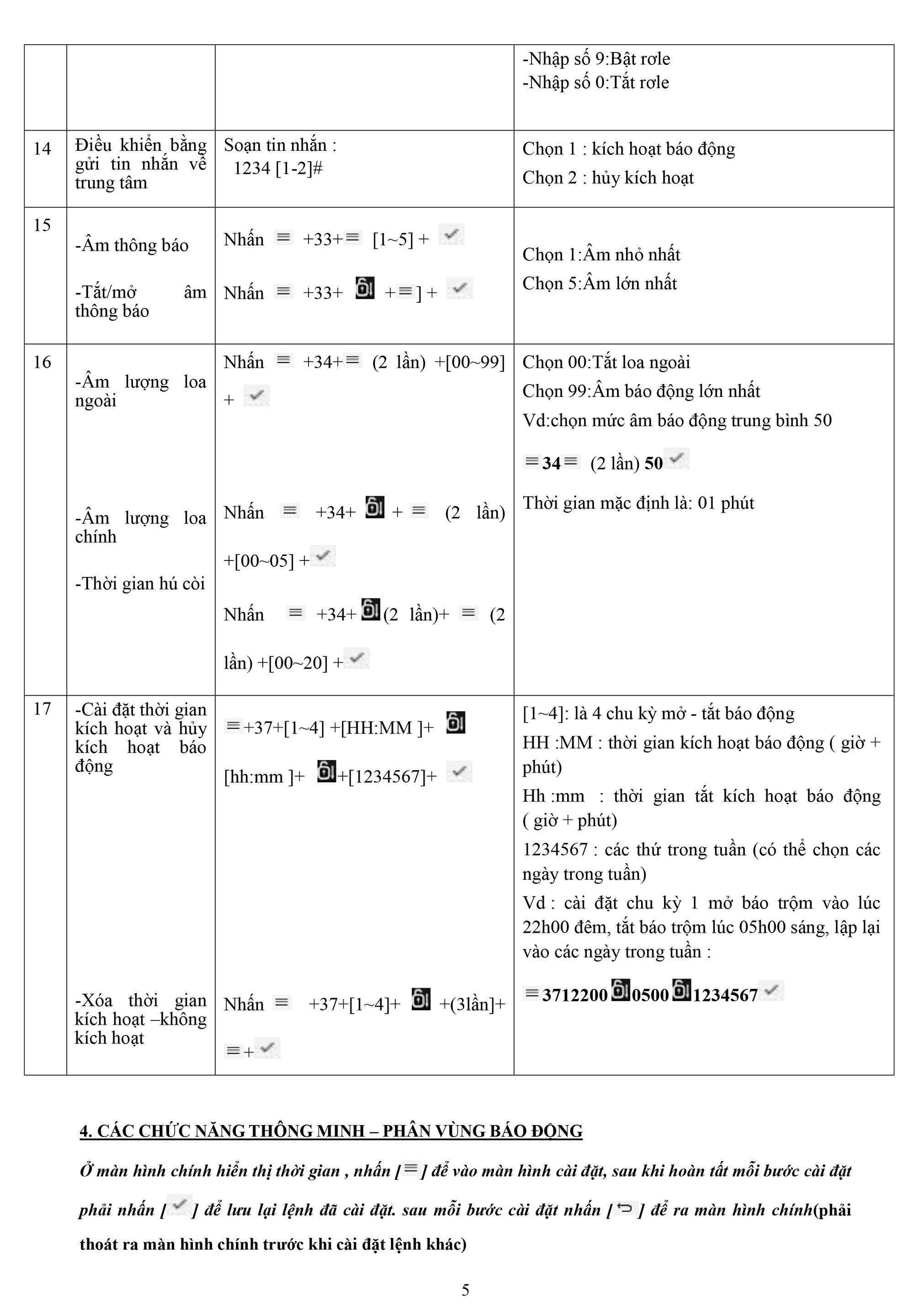 - Âm lượng báo động: loa rời 120dB, thời gian báo động 60~ 300 giây (mặc định 60 giây).