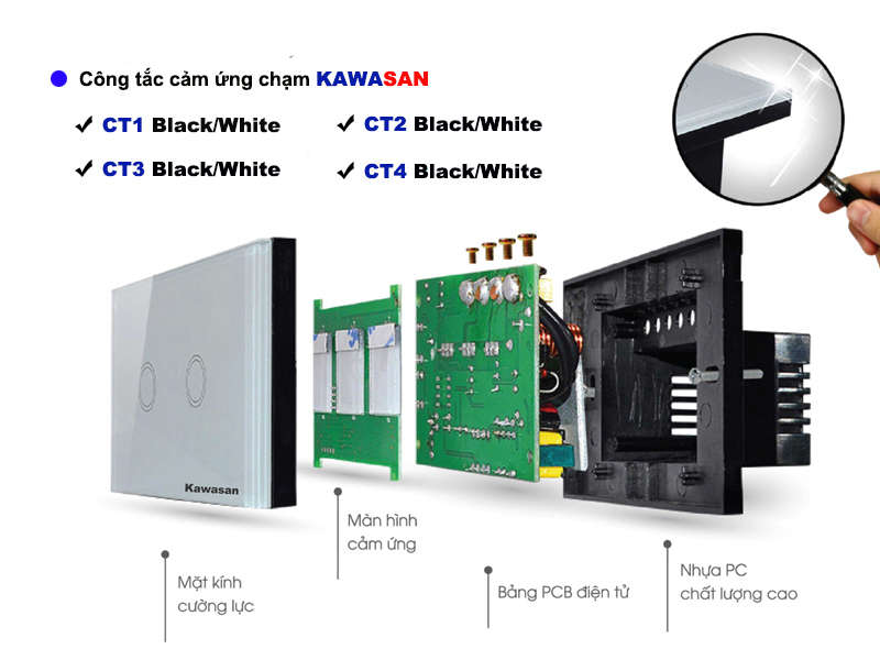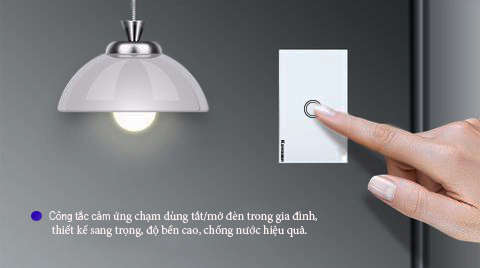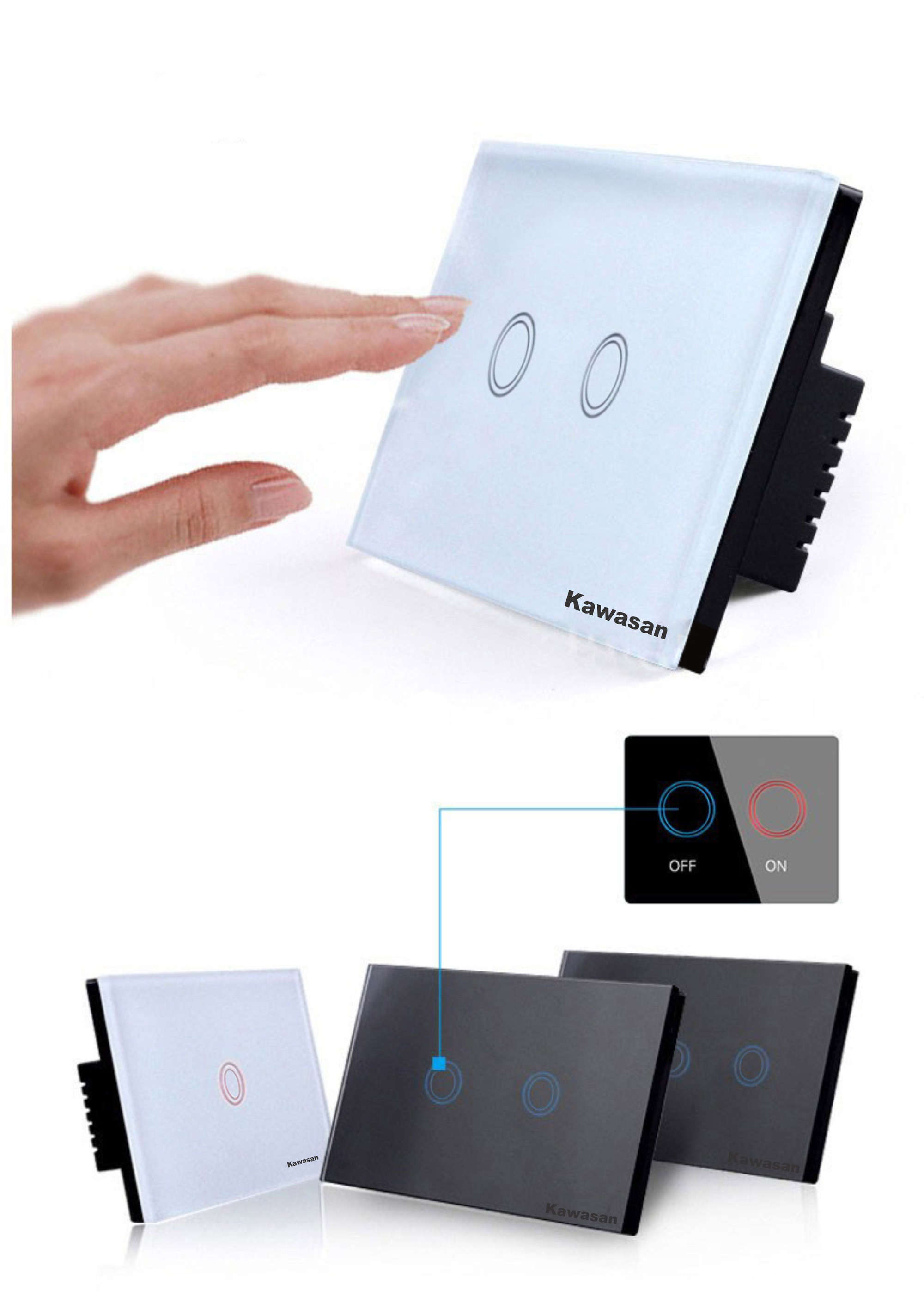 - Đây là công tắc cảm ứng chạm để bật/ tắt đèn dùng công nghệ cảm ứng điện dung . Với bề mặt kính cường lực sang trọng, chống xước, chống va đập, kết hợp với vòng sáng LED bao quanh đã tạo nên sự tinh tế, cuốn hút của công tắc cảm ứng chạm . Mỗi nút cảm ứng trên bề mặt công tắc được hiển thị trạng thái vòng viền màu xanh ,đỏ. Kết hợp với tính năng mở rộng để điều khiển từ xa, giờ đây bạn có thể điều khiển bật tắt đèn từ xa qua remote hay điều khiển điện thông minh bằng smart phone ở bất cứ nơi đâu qua trung tâm kết nối điều khiển thông minh Kawasan