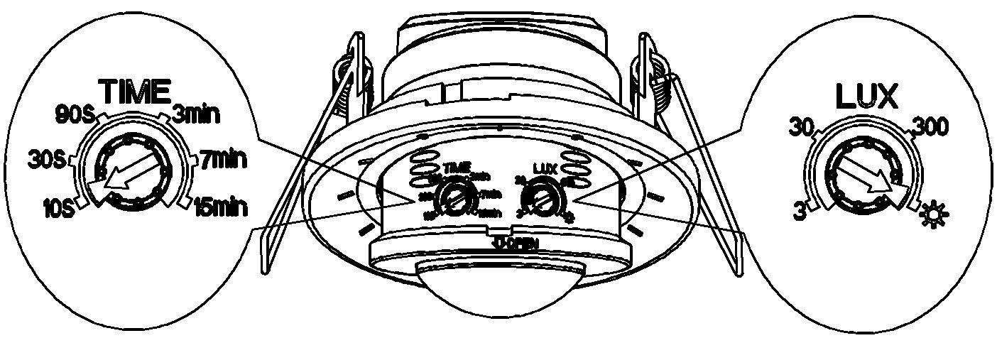- Nếu người dùng điều chỉnh nút LUX xoay về phía “mặt trời “thì cảm biến sẽ luôn luôn được kích hoạt. Trạng thái sẵn sàng nhận chuyển động thân nhiệt trong vùng quét để bật đèn. Còn gọi là cảm ứng cả ngày lẫn đêm.