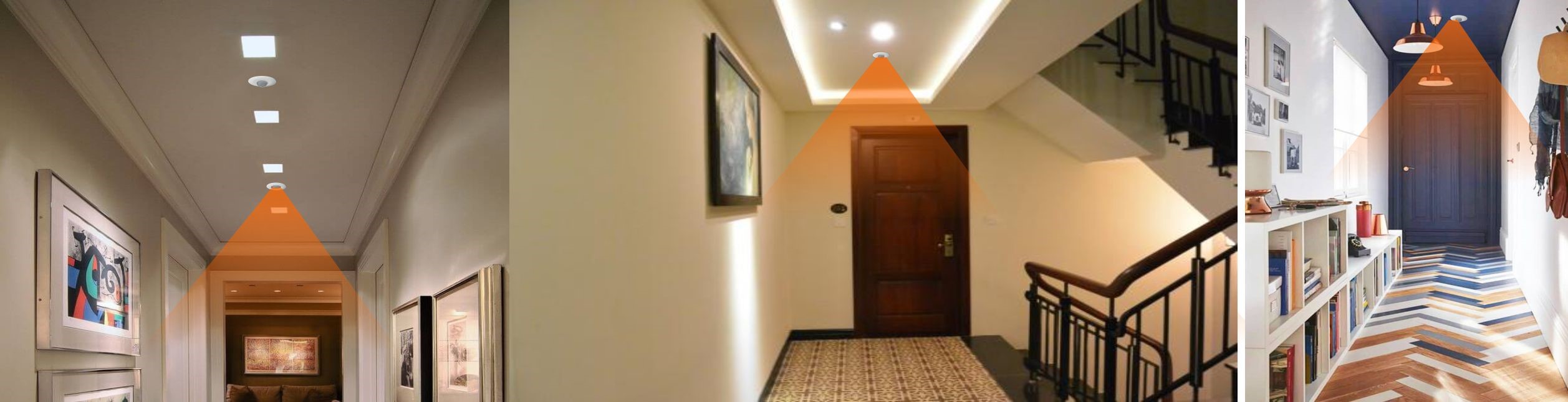 - Đối với cầu thang: Nên chọn loại cảm ứng vi sóng RS02D hoặc RS03B. Lắp giữa cầu thang, bên cạnh đền hiện hữu, để có góc quét rộng 150-1600 quét được cả trên và dưới cầu thang.