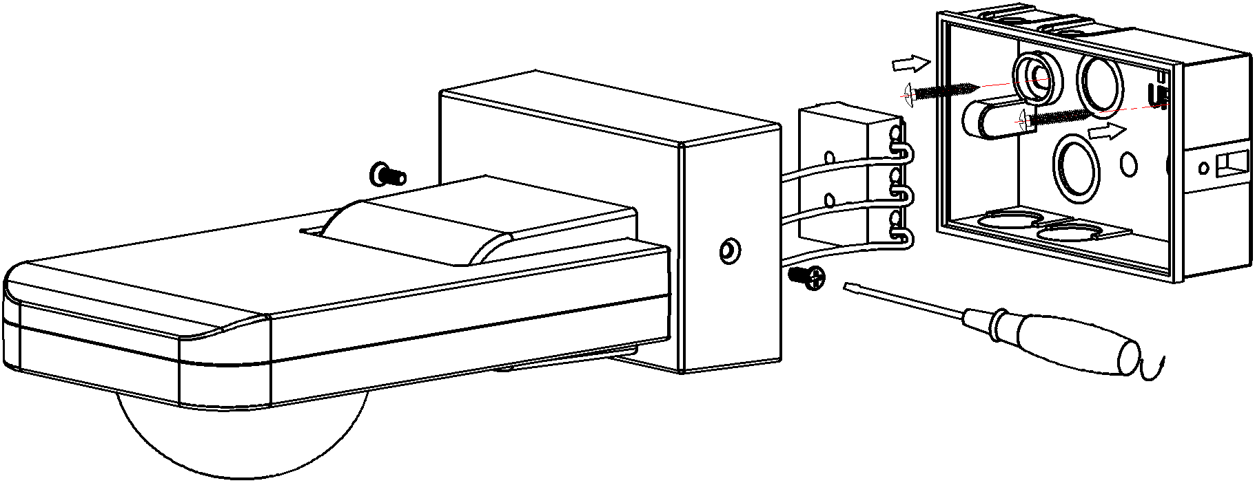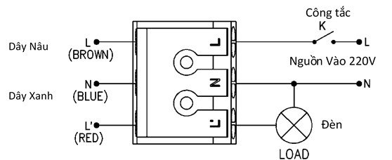 Kết nối dây nguồn và tải cho cảm ứng như sơ đồ trên: N và L đấu vào nguồn điện 220v, N và L’ ra đèn/quạt hút.