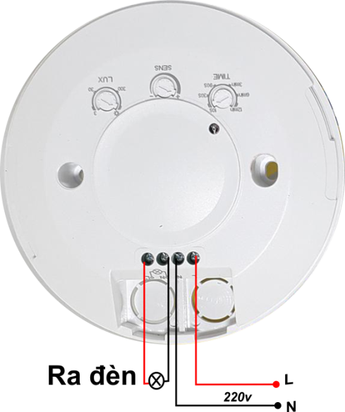 - Kết nối dây nguồn và tải cho cảm ứng như sơ đồ bên (Teminal N và L đấu vào nguồn điện 220V, N và L’ ra đèn)