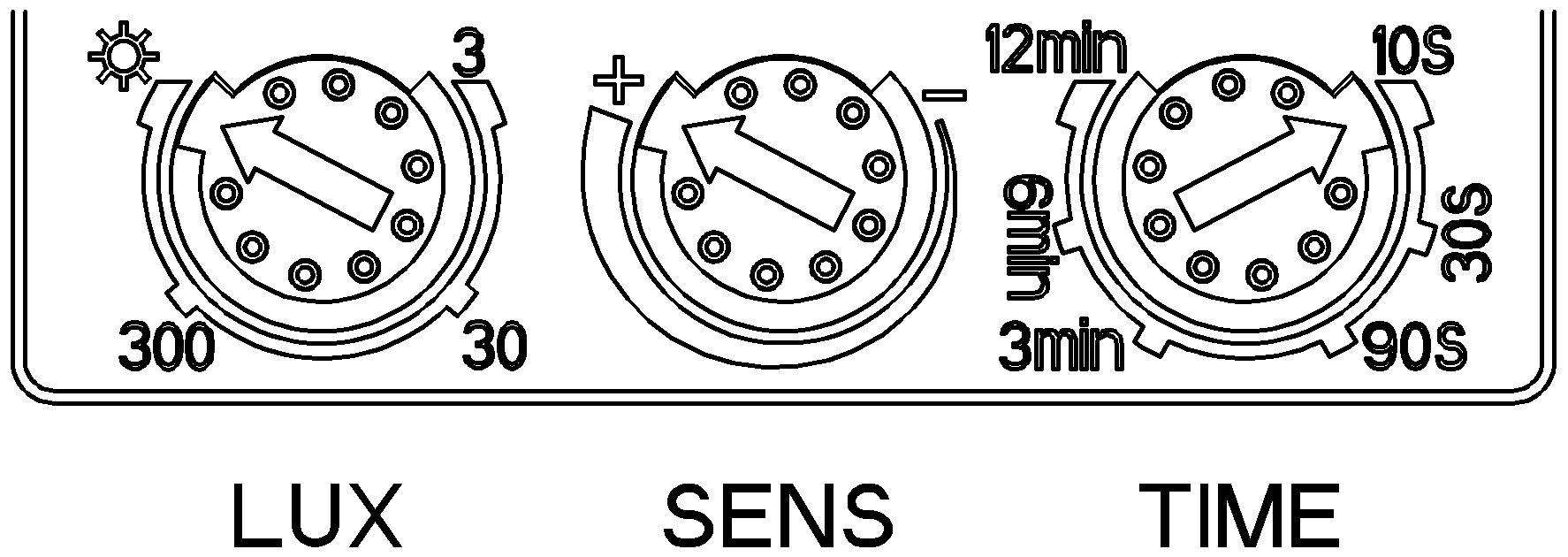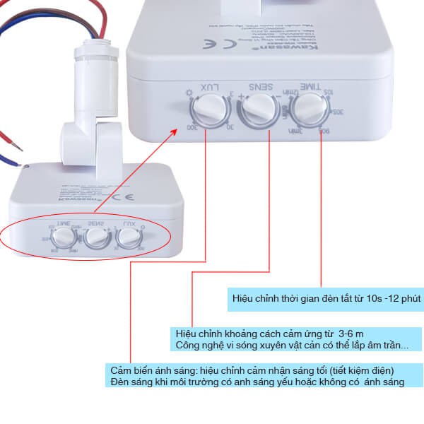 Nút SENS: Điều chỉnh khoảng cách phát sóng radar để nhận chuyển động. Khoảng cách chỉnh tối thiểu 2m“Dấu – “ khoảng cách chỉnh tối đa 12m“Dấu + “