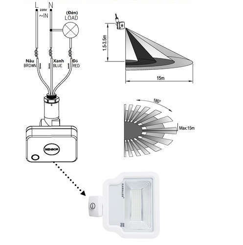 - Độ sáng điều chỉnh cảm biến hoạt động: từ 3 LUX(tối) đến 2000 LUX(sáng)