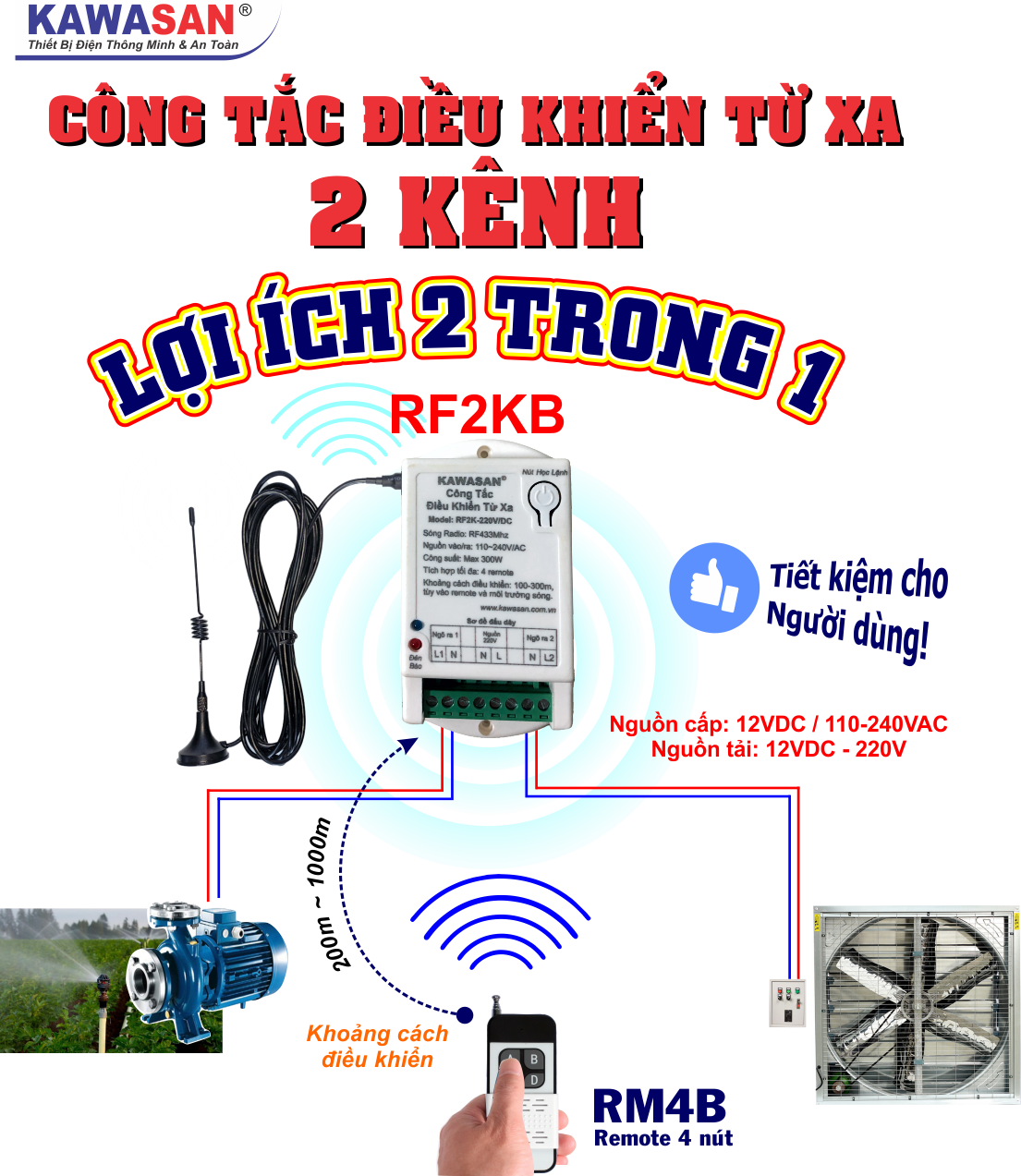 - Công tắc RF2KB là công tắc điều khiển từ xa 2 kênh. Có thể điều khiển 2 thiết bị 1 cách độc lập vô cùng tiện dụng.