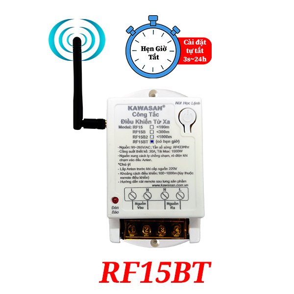 Công tắc điều khiển từ xa RF15BT, ngoài chức năng điều khiển bật/tắt từ xa như các công tắc thông thường. Còn có thêm chức năng cài đặt cho công tắc tự tắt sau khi bật từ xa bằng Remote. Giúp cho người dùng không phải mất thời gian chờ để tắt. Ví dụ: khi dùng Remote bật cho hệ thống Bơm tưới cây, bơm sục khí ao nuôi tôm – cá…thì sau 15 phút đến 60 phút phải tắt. Lúc này phải ngồi chờ và căn cho đủ thời gian để tắt.